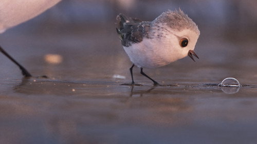 Стая представителей бекасовых охотится за едой у побережья, бросаясь клевать на песок, когда волна уходит, а когда наступает, они убегают. Одна маленькая представительца семейства бекасовых так воодушевлена своей мамой, что решается присоединиться к стае, но ей не удалось вовремя отступить, поэтому она полностью промокла от волны. Происшествие оставляет её запуганной водой; она отказывается покидать гнездышко, но скоро замечает группу раков-отшельников, закапывающихся в песок в поиске еды, оставаясь защищенными от волн. Копируя их поведение, птичка узрела красоту подводного мира и стала умелой в поиске еды для стаи.